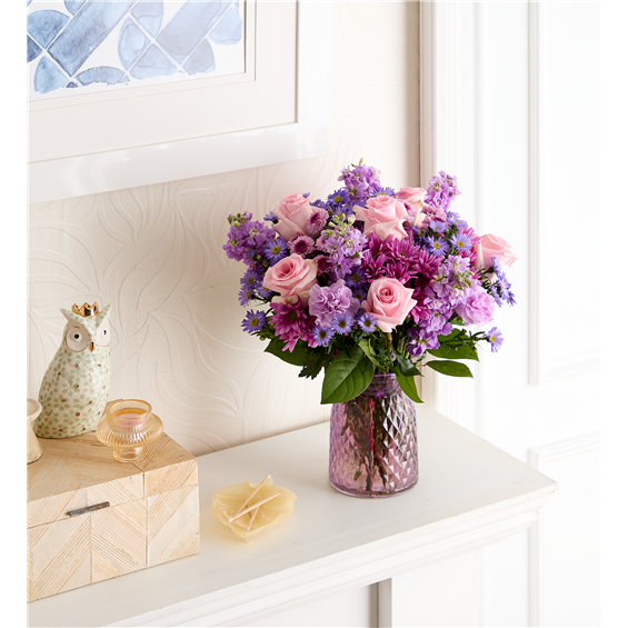 EXCLUSIVE Just like a daydream. Our delightful lavender bouquet is gathered with accents of pink and lush greenery in an embossed lavender vase that complements the delicate beauty of the blooms.